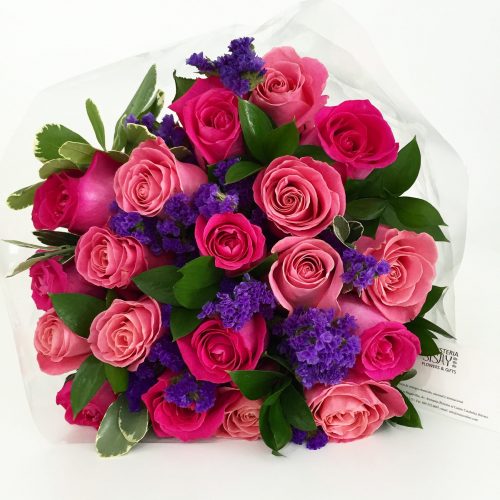 Fantástica combinación de 19 rosas con frescas hojas verdes y hermoso follaje en tonos morados.